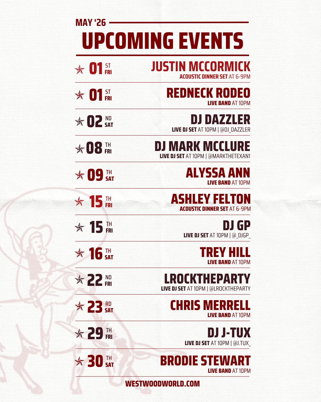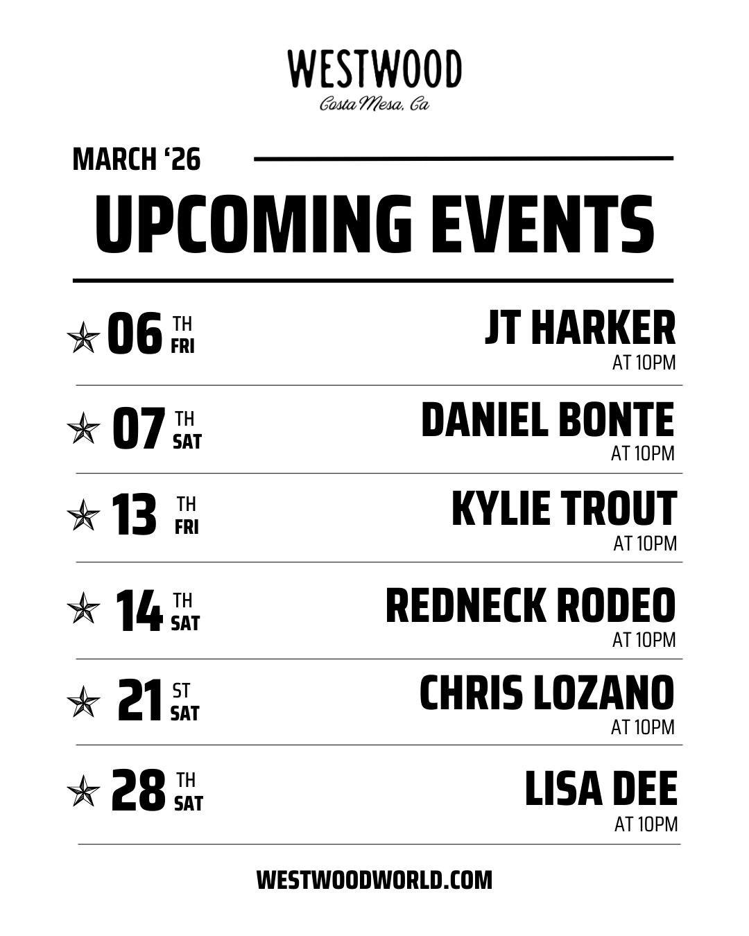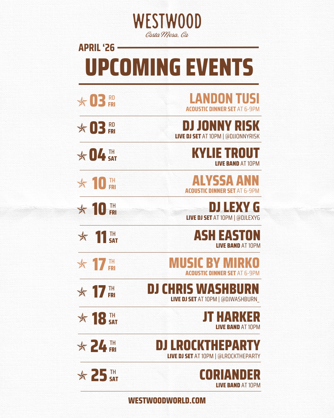 Westwood regularly has live music on Fridays and Saturdays. In 2026, we will host acoustic dinners on Fridays, followed by a DJ after 10pm. On Saturdays, we will showcase Orange County’s top bands at 10pm.